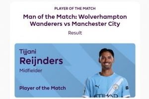 赛后据英超官方消息,曼城中场赖因德斯以52%的得票当选此役全场最佳球员。