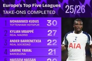 欧洲五大联赛 25/26 赛季成功过人榜